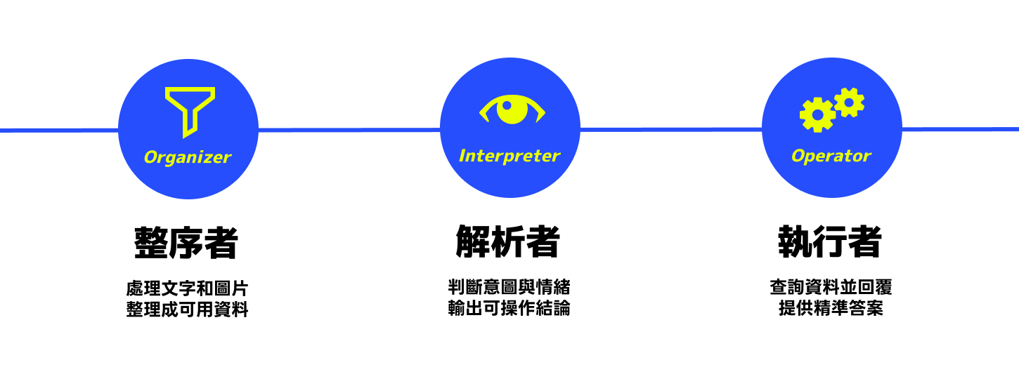 AI 客服不再是早期那種依賴制式回應的聊天機器人,而是一套能理解語意、判斷情境並執行動作的智慧化客服系統。為了讓企業在實際場景中保持可控、可調整、可量化,我們將 AI 能力拆分成三大核心角色,並以多個專職代理人負責不同任務,而不是倚賴單一、全能卻難以管理的巨型模型。