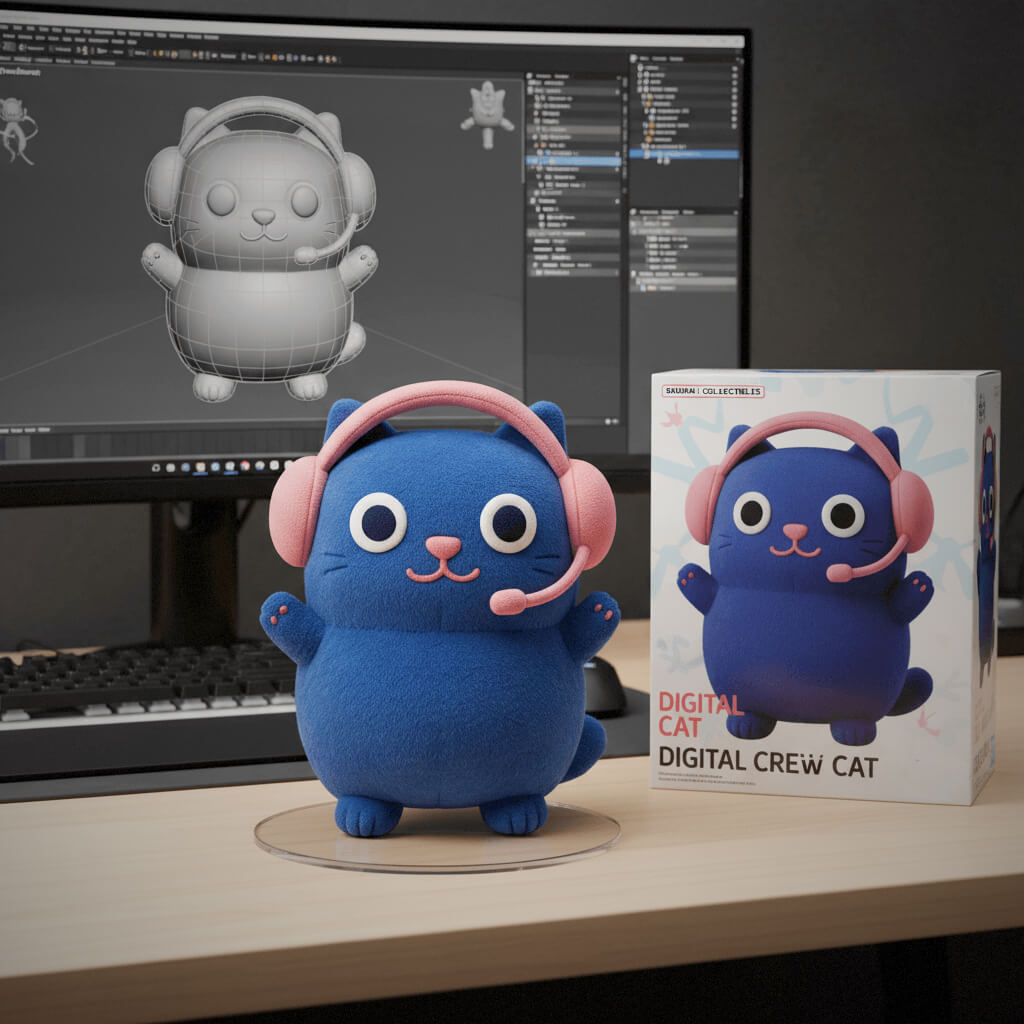 - 風格定位:設計師藝術公仔、虛擬角色商品化、數位潮玩、3D 虛擬角色轉實體公仔、角色品牌視覺模擬