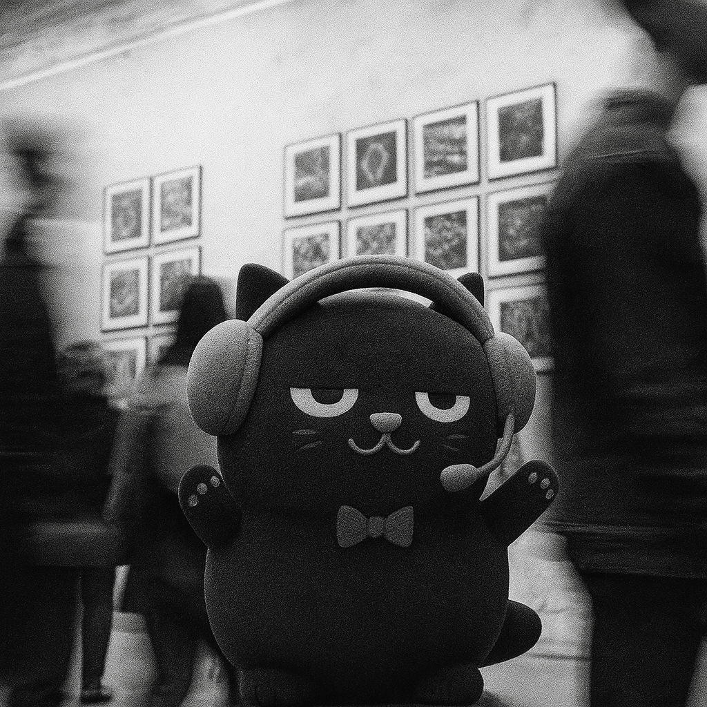 - 參考風格關鍵詞:black and white street photography, grainy film texture, slow shutter crowd blur, virtual mascot in real world, gallery interior background, cultural mood shot, urban still life, soft focus edge, photojournalism aesthetic, character in real scene, analog visual tone, high contrast grayscale, visual narrative tension