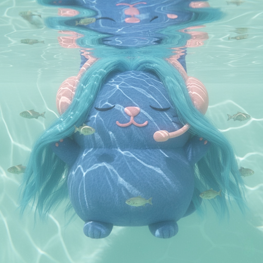 - 質感與色調:整體色調以柔和水綠與銀灰為主,搭配角色深色輪廓與暖膚色調,在畫面中形成輕盈而靜謐的視覺層次。水面與水下反射自然過渡,水波紋在皮膚與衣物上產生自然扭曲與高光,髮絲漂浮呈現柔性動態,與角色圓潤體態平衡呼應。魚群環繞、背景簡潔,讓整體氛圍更顯夢幻,色調控制極具「畫面留白」概念,沒有多餘資訊干擾,純粹聚焦於角色存在本身。